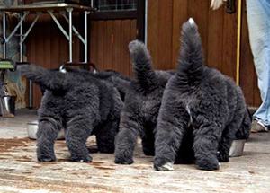 As for amounts, a typical adult Newf will consume about 4 cups of food per day (most Newf owners feed their dogs twice per day rather than one large meal). At that rate, a 38-40 pound bag of dog food will last about 4-5 weeks. Puppies are typically fed three times per day until they are anywhere from 6 to 10 months of age; consult your vet or breeder to ensure you’re feeding appropriate amounts. If you give your dog treats regularly, scale back appropriately at feeding time so your dog doesn’t get too many calories; allowing a Newf (or any dog) to become overweight is inviting health trouble.
